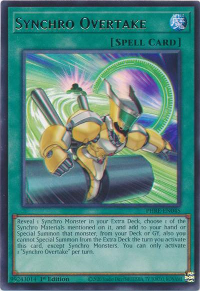 Reveal 1 Synchro Monster in your Extra Deck, choose 1 of the Synchro Materials whose name is listed on that card, and add to your hand or Special Summon that monster, from your Deck or GY, also you cannot Special Summon monsters from the Extra Deck the turn you activate this card, except Synchro Monsters. You can only activate 1 ‘Synchro Overtake’ per turn.