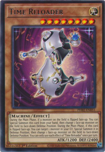 During the Main Phase, if a monster on the field is flipped face-up: You can Special Summon this card from your hand, then change 1 face-up monster on the field to face-down Defense Position. During the Main Phase, if this card is flipped face-up: You can target 1 monster in your GY; Special Summon it in Defense Position, then change 1 face-up monster on the field to face-down Defense Position. You can only use each effect of ‘Time Reloader’ once per turn.
