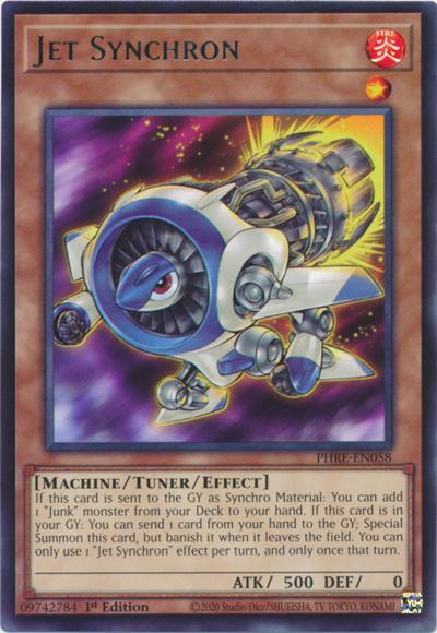 If this card is sent to the GY as Synchro Material: You can add 1 ‘Junk’ monster from your Deck to your hand. If this card is in your GY: You can send 1 card from your hand to the GY; Special Summon this card, but banish it when it leaves the field. You can only use 1 ‘Jet Synchron’ effect per turn, and only once that turn.