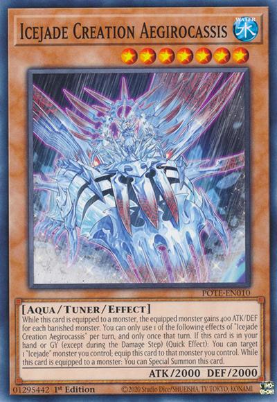 While this card is equipped to a monster, the equipped monster gains 400 ATK/DEF for each banished monster. You can only use 1 of the following effects of ‘Icejade Creation Aegirocassis’ per turn, and only once that turn. If this card is in your hand or GY (except during the Damage Step) (Quick Effect): You can target 1 ‘Icejade’ monster you control; equip this card to that monster you control. While this card is equipped to a monster: You can Special Summon this card.