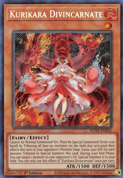 Cannot be Normal Summoned/Set. Must be Special Summoned (from your hand) by Tributing all face-up monsters on the field that activated their effects this turn in your opponent’s Monster Zone. Gains 1500 ATK for each monster Tributed to Special Summon this card. During your End Phase: You can target 1 monster in your opponent’s GY; Special Summon it to your field. You can only use this effect of ‘Kurikara Divincarnate’ once per turn.