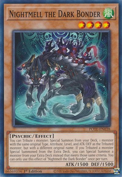You can Tribute 1 monster; Special Summon from your Deck, 1 monster with the same original Type, Attribute, Level, and ATK/DEF as the Tributed monster, but with a different original name. If you Tributed a monster Special Summoned from the Extra Deck, you can Special Summon a monster from your Extra Deck instead that meets those same criteria. You can only use this effect of ‘Nightmell the Dark Bonder’ once per turn.