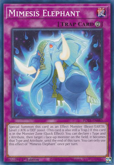 Special Summon this card as an Effect Monster (Beast/EARTH/Level 2/ATK 0/DEF 2000). (This card is also still a Trap.) If this card is in the Monster Zone (Quick Effect): You can declare 1 Type and 1 Attribute, then target 1 face-up monster on the field; it becomes that Type and Attribute, until the end of this turn. You can only use this effect of ‘Mimesis Elephant’ once per turn.