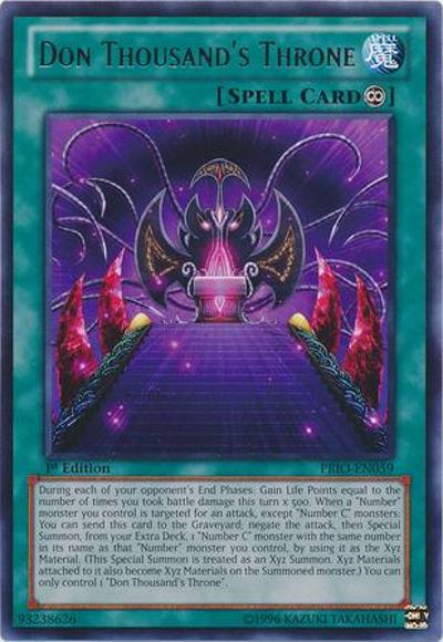 During each of your opponent’s End Phases: Gain Life Points equal to the number of times you took battle damage this turn x 500. When a ‘Number’ monster you control is targeted for an attack, except ‘Number C’ monsters: You can send this card to the Graveyard; negate the attack, then Special Summon, from your Extra Deck, 1 ‘Number C’ monster with the same number in its name as that ‘Number’ monster you control, by using it as the Xyz Material. (This Special Summon is treated as an Xyz Summon. Xyz Materials attached to it also become Xyz Materials on the Summoned monster.) You can only control 1 ‘Don Thousand’s Throne’.