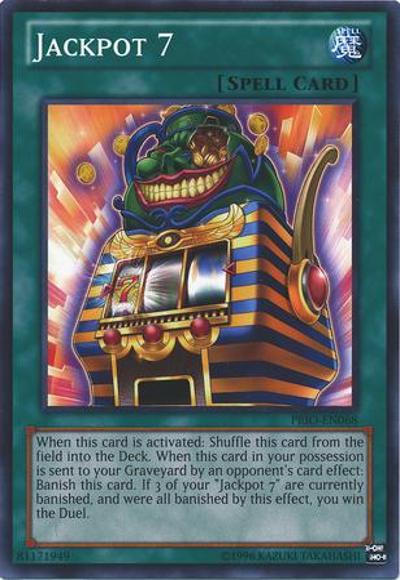 When this card is activated: Shuffle this card from the field into the Deck. When this card in your possession is sent to your Graveyard by an opponent’s card effect: Banish this card. If 3 of your ‘Jackpot 7’ are currently banished, and were all banished by this effect, you win the Duel.