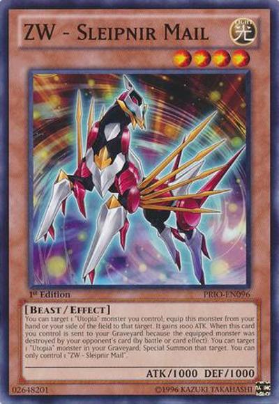 You can target 1 ‘Utopia’ monster you control; equip this monster from your hand or your side of the field to that target. It gains 1000 ATK. When this card you control is sent to your Graveyard because the equipped monster was destroyed by your opponent’s card (by battle or card effect): You can target 1 ‘Utopia’ monster in your Graveyard; Special Summon that target. You can only control 1 ‘ZW – Sleipnir Mail’.