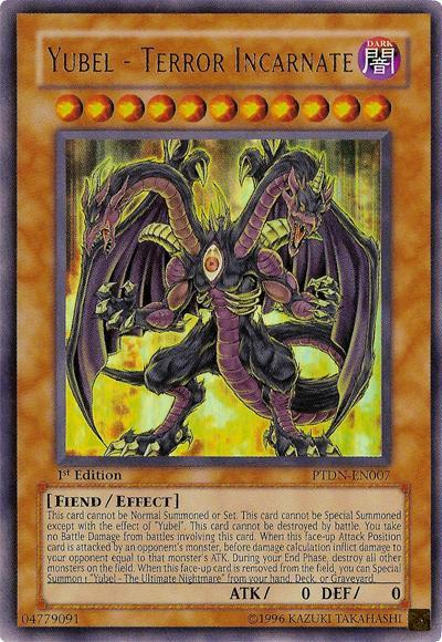 Cannot be Normal Summoned or Set. Must be Special Summoned by ‘Yubel’, and cannot be Special Summoned by other ways. This card cannot be destroyed by battle. You take no Battle Damage from battles involving this card. Before damage calculation, when this face-up Attack Position card is attacked by an opponent’s monster: Inflict damage to your opponent equal to that monster’s ATK. During your End Phase: Destroy all other monsters on the field. When this face-up card leaves the field: You can Special Summon 1 ‘Yubel – The Ultimate Nightmare’ from your hand, Deck, or Graveyard.