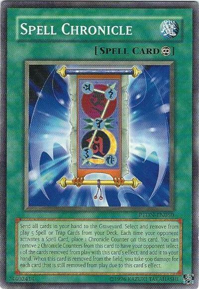 Send all cards in your hand to the Graveyard. Select and remove from play 5 Spell or Trap Cards from your Deck. Each time your opponent activates a Spell Card, place 1 Chronicle Counter on this card. You can remove 2 Chronicle Counters from this card to have your opponent select 1 of the cards removed from play with this card’s effect, and add it to your hand. When this card is removed from the field, you take 500 damage for each card that is still removed from play due to this card’s effect.