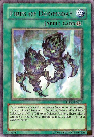 Special Summon 2 ‘Doomsday Tokens’ (Fiend/DARK/Level 1/ATK 0/DEF 0) in Defense Position. They cannot be Tributed for a Tribute Summon, unless it is for a DARK monster. You cannot Summon other monsters the turn you activate this card (but you can Normal Set).