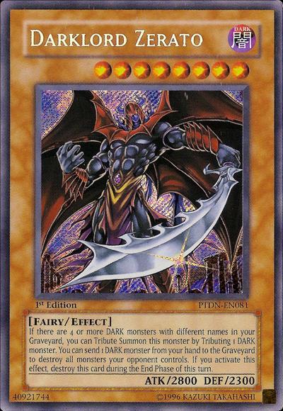 If you have 4 or more DARK monsters with different names in your Graveyard, you can Tribute Summon this card by Tributing 1 DARK monster. You can send 1 DARK monster from your hand to the Graveyard; destroy all monsters your opponent controls. Once per turn, during the End Phase, if this effect was activated this turn: Destroy this card.