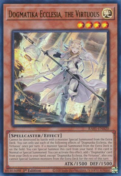 Cannot be destroyed by battle with a monster Special Summoned from the Extra Deck. You can only use each of the following effects of ‘Dogmatika Ecclesia, the Virtuous’ once per turn. If a monster Special Summoned from the Extra Deck is on the field: You can Special Summon this card from your hand. If this card is Normal or Special Summoned: You can activate this effect; add 1 ‘Dogmatika’ card from your Deck to your hand, except ‘Dogmatika Ecclesia, the Virtuous’, also you cannot Special Summon monsters from the Extra Deck for the rest of this turn.