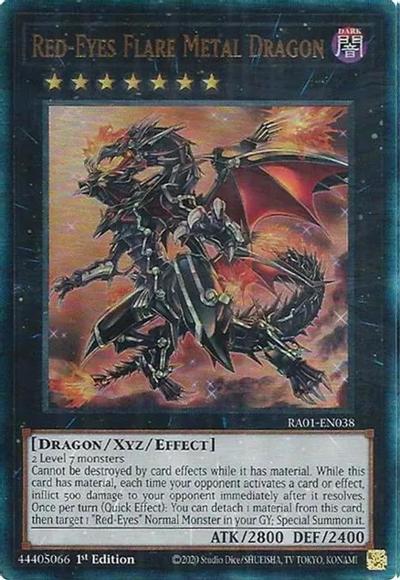 2 Level 7 monstersCannot be destroyed by card effects while it has Xyz Material. While this card has Xyz Material, each time your opponent activates a card or effect, inflict 500 damage to your opponent immediately after it resolves. Once per turn, during either player’s turn: You can detach 1 Xyz Material from this card, then target 1 ‘Red-Eyes’ Normal Monster in your Graveyard; Special Summon it.
