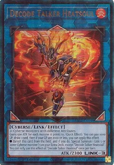 2+ Cyberse monsters with different AttributesGains 500 ATK for each monster it points to. (Quick Effect): You can pay 1000 LP; draw 1 card, then if your LP are 2000 or less, you can apply this effect.● Banish this card from the field, and if you do, Special Summon 1 Link-3 or lower Cyberse monster from your Extra Deck, except ‘Decode Talker Heatsoul’.You can only use this effect of ‘Decode Talker Heatsoul’ once per turn.