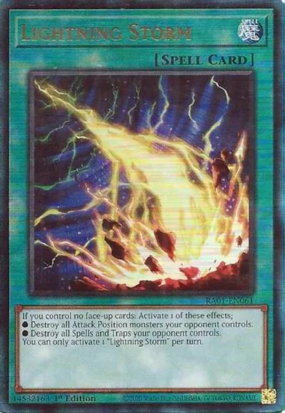 If you control no face-up cards: Activate 1 of these effects;● Destroy all Attack Position monsters your opponent controls.● Destroy all Spells and Traps your opponent controls.You can only activate 1 ‘Lightning Storm’ per turn.