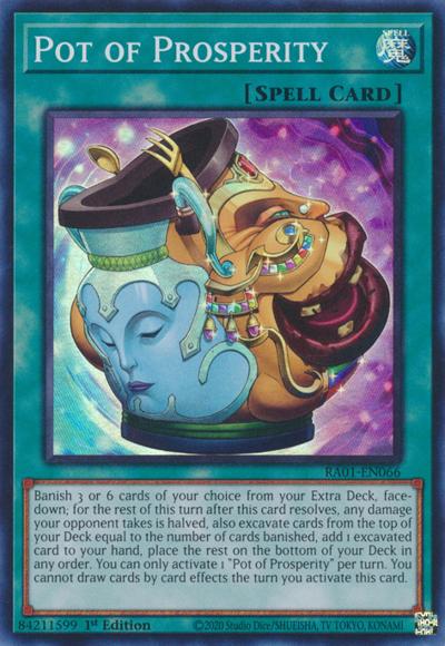 Banish 3 or 6 cards of your choice from your Extra Deck, face-down; for the rest of this turn after this card resolves, any damage your opponent takes is halved, also excavate cards from the top of your Deck equal to the number of cards banished, add 1 excavated card to your hand, place the rest on the bottom of your Deck in any order. You can only activate 1 ‘Pot of Prosperity’ per turn. You cannot draw cards by card effects the turn you activate this card.