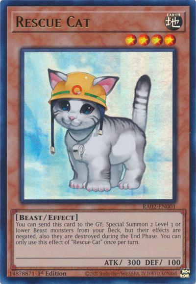 You can send this card to the Graveyard; Special Summon 2 Level 3 or lower Beast-Type monsters from your Deck, but they have their effects negated, also they are destroyed during the End Phase. You can only use this effect of ‘Rescue Cat’ once per turn.