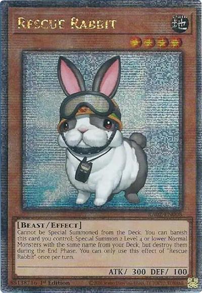 Cannot be Special Summoned from the Deck. You can banish this face-up card you control; Special Summon 2 Level 4 or lower Normal Monsters with the same name from your Deck, but destroy them during the End Phase. You can only use this effect of ‘Rescue Rabbit’ once per turn.