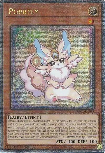 If this card is Normal or Special Summoned: You can excavate the top 3 cards of your Deck, and if you do, you can add 1 excavated ‘Purrely’ Spell/Trap to your hand, also place the rest on the bottom of your Deck in any order. Once per turn, during your Main Phase: You can reveal 1 ‘Purrely’ Quick-Play Spell in your hand, Special Summon 1 Xyz Monster from your Extra Deck that mentions that card, by using this card you control as material, and attach the revealed card to the Summoned monster. (This is treated as an Xyz Summon.)