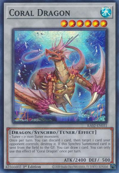 1 Tuner + 1+ non-Tuner monstersOnce per turn: You can discard 1 card, then target 1 card your opponent controls; destroy it. If this Synchro Summoned card is sent from the field to the GY: You can draw 1 card. You can only use this effect of ‘Coral Dragon’ once per turn.