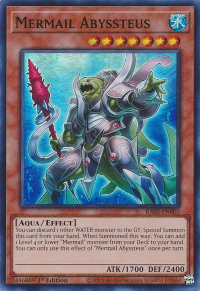 You can discard 1 other WATER monster to the GY; Special Summon this card from your hand. When Summoned this way: You can add 1 Level 4 or lower ‘Mermail’ monster from your Deck to your hand. You can only use this effect of ‘Mermail Abyssteus’ once per turn.