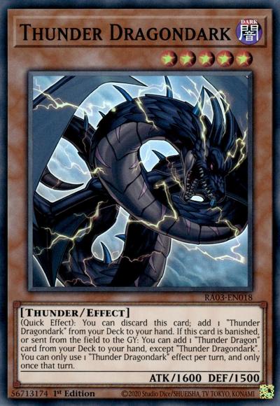 (Quick Effect): You can discard this card; add 1 ‘Thunder Dragondark’ from your Deck to your hand. If this card is banished, or sent from the field to the GY: You can add 1 ‘Thunder Dragon’ card from your Deck to your hand, except ‘Thunder Dragondark’. You can only use 1 ‘Thunder Dragondark’ effect per turn, and only once that turn.