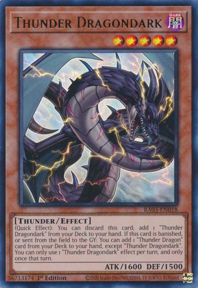 (Quick Effect): You can discard this card; add 1 ‘Thunder Dragondark’ from your Deck to your hand. If this card is banished, or sent from the field to the GY: You can add 1 ‘Thunder Dragon’ card from your Deck to your hand, except ‘Thunder Dragondark’. You can only use 1 ‘Thunder Dragondark’ effect per turn, and only once that turn.