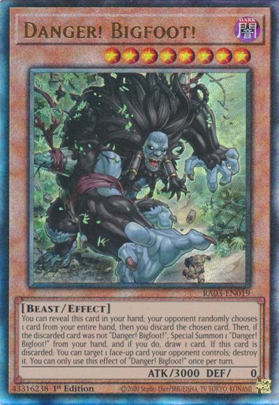 You can reveal this card in your hand; your opponent randomly chooses 1 card from your entire hand, then you discard the chosen card. Then, if the discarded card was not ‘Danger! Bigfoot!’, Special Summon 1 ‘Danger! Bigfoot!’ from your hand, and if you do, draw 1 card. If this card is discarded: You can target 1 face-up card your opponent controls; destroy it. You can only use this effect of ‘Danger! Bigfoot!’ once per turn.