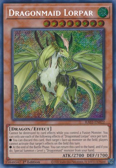 Cannot be destroyed by card effects while you control a Fusion Monster. You can only use each of the following effects of ‘Dragonmaid Lorpar’ once per turn.● You can discard this card, then target 1 face-up monster on the field; players cannot activate that target’s effects on the field this turn.● At the end of the Battle Phase: You can return this card to the hand, and if you do, Special Summon 1 Level 3 ‘Dragonmaid’ monster from your hand.