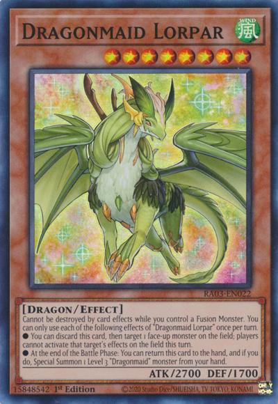 Cannot be destroyed by card effects while you control a Fusion Monster. You can only use each of the following effects of ‘Dragonmaid Lorpar’ once per turn.● You can discard this card, then target 1 face-up monster on the field; players cannot activate that target’s effects on the field this turn.● At the end of the Battle Phase: You can return this card to the hand, and if you do, Special Summon 1 Level 3 ‘Dragonmaid’ monster from your hand.