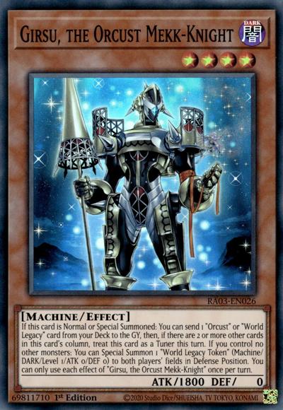 If this card is Normal or Special Summoned: You can send 1 ‘Orcust’ or ‘World Legacy’ card from your Deck to the GY, then, if there are 2 or more other cards in this card’s column, treat this card as a Tuner this turn. If you control no other monsters: You can Special Summon 1 ‘World Legacy Token’ (Machine/DARK/Level 1/ATK 0/DEF 0) to both players’ fields in Defense Position. You can only use each effect of ‘Girsu, the Orcust Mekk-Knight’ once per turn.