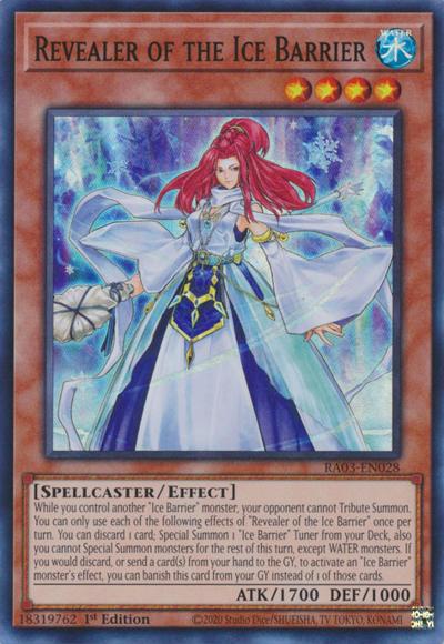 While you control another ‘Ice Barrier’ monster, your opponent cannot Tribute Summon. You can only use each of the following effects of ‘Revealer of the Ice Barrier’ once per turn. You can discard 1 card; Special Summon 1 ‘Ice Barrier’ Tuner from your Deck, also you cannot Special Summon monsters for the rest of this turn, except WATER monsters. If you would discard, or send a card(s) from your hand to the GY, to activate an ‘Ice Barrier’ monster’s effect, you can banish this card from your GY instead of 1 of those cards.