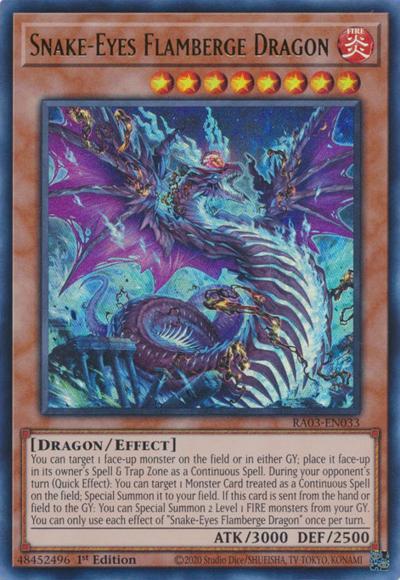 You can target 1 face-up monster on the field or in either GY; place it face-up in its owner’s Spell & Trap Zone as a Continuous Spell. During your opponent’s turn (Quick Effect): You can target 1 Monster Card treated as a Continuous Spell on the field; Special Summon it to your field. If this card is sent from the hand or field to the GY: You can Special Summon 2 Level 1 FIRE monsters from your GY. You can only use each effect of ‘Snake-Eyes Flamberge Dragon’ once per turn.