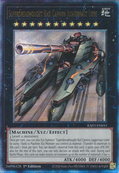 3 Level 11 monstersOnce per turn, you can also Xyz Summon ‘Superdreadnought Rail Cannon Juggernaut Liebe’ by using 1 Rank 10 Machine Xyz Monster you control as material. (Transfer its materials to this card.) Once per turn: You can detach 1 material from this card; it gains 2000 ATK/DEF, also for the rest of this turn, you can only declare an attack with this card. During each Battle Phase, this card can make attacks on monsters up to the number of Xyz Materials it has +1.
