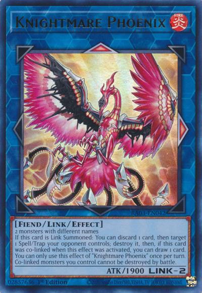 2 monsters with different namesIf this card is Link Summoned: You can discard 1 card, then target 1 Spell/Trap your opponent controls; destroy it, then, if this card was co-linked when this effect was activated, you can draw 1 card. You can only use this effect of ‘Knightmare Phoenix’ once per turn. Co-linked monsters you control cannot be destroyed by battle.