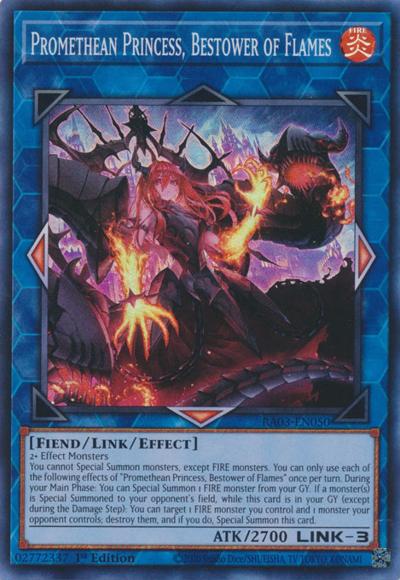 2+ Effect MonstersYou cannot Special Summon monsters, except FIRE monsters. You can only use each of the following effects of ‘Promethean Princess, Bestower of Flames’ once per turn. During your Main Phase: You can Special Summon 1 FIRE monster from your GY. If a monster(s) is Special Summoned to your opponent’s field, while this card is in your GY (except during the Damage Step): You can target 1 FIRE monster you control and 1 monster your opponent controls; destroy them, and if you do, Special Summon this card.