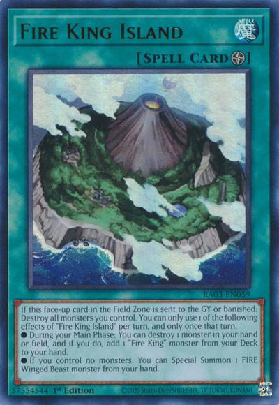 If this face-up card in the Field Zone is sent to the Graveyard or banished: Destroy all monsters you control. You can only use 1 of the following effects of ‘Fire King Island’ per turn, and only once that turn.● During your Main Phase: You can destroy 1 monster in your hand or you control, and if you do, add 1 ‘Fire King’ monster from your Deck to your hand.● If you control no monsters: You can Special Summon 1 FIRE Winged Beast-Type monster from your hand.