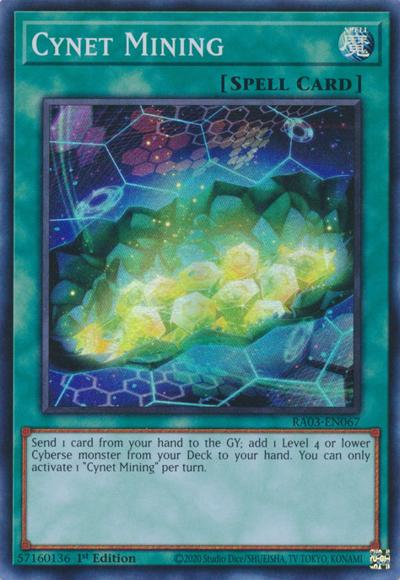 Send 1 card from your hand to the GY; add 1 Level 4 or lower Cyberse monster from your Deck to your hand. You can only activate 1 ‘Cynet Mining’ per turn.