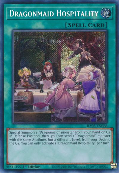 Special Summon 1 ‘Dragonmaid’ monster from your hand or GY in Defense Position, then, you can send 1 ‘Dragonmaid’ monster with the same Attribute, but a different Level, from your Deck to the GY. You can only activate 1 ‘Dragonmaid Hospitality’ per turn.