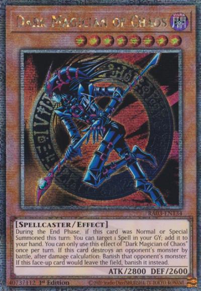 During the End Phase, if this card was Normal or Special Summoned this turn: You can target 1 Spell in your GY; add it to your hand. You can only use this effect of ‘Dark Magician of Chaos’ once per turn. If this card destroys an opponent’s monster by battle, after damage calculation: Banish that opponent’s monster. If this face-up card would leave the field, banish it instead.