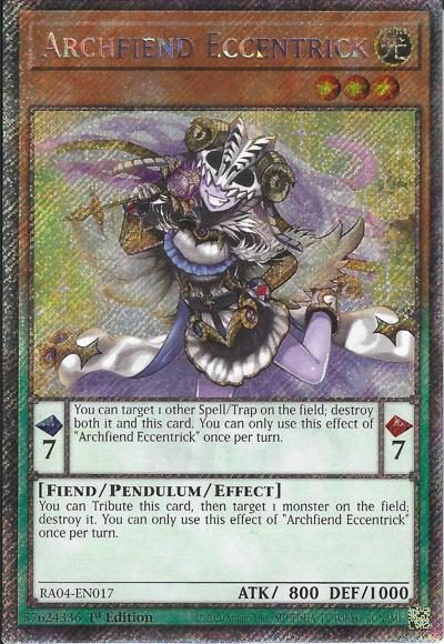 Pendulum EffectYou can target 1 other Spell/Trap Card on the field; destroy both it and this card. You can only use this effect of ‘Archfiend Eccentrick’ once per turn.Monster EffectYou can Tribute this card, then target 1 monster on the field; destroy it. You can only use this effect of ‘Archfiend Eccentrick’ once per turn.