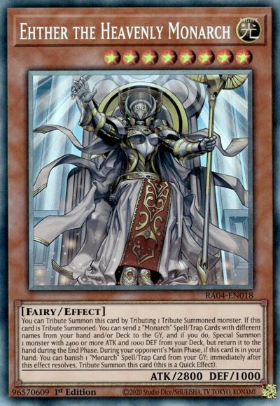 You can Tribute Summon this card by Tributing 1 Tribute Summoned monster. If this card is Tribute Summoned: You can send 2 ‘Monarch’ Spell/Trap Cards with different names from your hand and/or Deck to the Graveyard, and if you do, Special Summon 1 monster with 2400 or more ATK and 1000 DEF from your Deck, but return it to the hand during the End Phase. During your opponent’s Main Phase, if this card is in your hand: You can banish 1 ‘Monarch’ Spell/Trap Card from your Graveyard; immediately after this effect resolves, Tribute Summon this card (this is a Quick Effect).