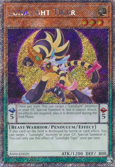 Pendulum EffectOnce per turn: You can target 1 ‘Lunalight’ monster in your Graveyard; Special Summon it, but it cannot attack, its effects are negated, also it is destroyed during the End Phase.Monster EffectIf this card on the field is destroyed by battle or card effect: You can target 1 ‘Lunalight’ monster in your Graveyard; Special Summon it. You can only use this effect of ‘Lunalight Tiger’ once per turn.