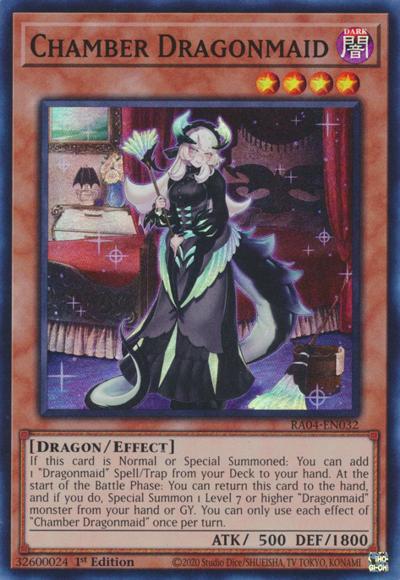 If this card is Normal or Special Summoned: You can add 1 ‘Dragonmaid’ Spell/Trap from your Deck to your hand. At the start of the Battle Phase: You can return this card to the hand, and if you do, Special Summon 1 Level 7 or higher ‘Dragonmaid’ monster from your hand or GY. You can only use each effect of ‘Chamber Dragonmaid’ once per turn.