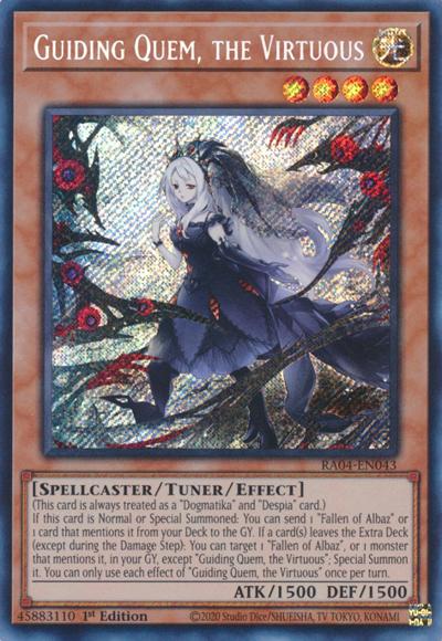 (This card is always treated as a ‘Dogmatika’ and ‘Despia’ card.)If this card is Normal or Special Summoned: You can send 1 ‘Fallen of Albaz’ or 1 card that mentions it from your Deck to the GY. If a card(s) leaves the Extra Deck (except during the Damage Step): You can target 1 ‘Fallen of Albaz’, or 1 monster that mentions it, in your GY, except ‘Guiding Quem, the Virtuous’; Special Summon it. You can only use each effect of ‘Guiding Quem, the Virtuous’ once per turn.