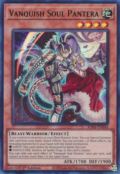 If you control no monsters in your Main Monster Zone: You can Special Summon this card from your hand. (Quick Effect): You can activate 1 of these effects, by revealing monster(s) in your hand with the listed Attribute(s);● EARTH: This card cannot be destroyed by battle this turn.● EARTH & FIRE: Destroy all Spells/Traps in this card’s column.You can only use each effect of ‘Vanquish Soul Pantera’ once per turn, and cannot activate more than 1 in the same Chain.