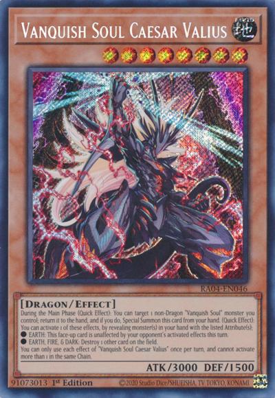 During the Main Phase (Quick Effect): You can target 1 non-Dragon ‘Vanquish Soul’ monster you control; return it to the hand, and if you do, Special Summon this card from your hand. (Quick Effect): You can activate 1 of these effects, by revealing monster(s) in your hand with the listed Attribute(s);● EARTH: This face-up card is unaffected by your opponent’s activated effects this turn.● EARTH, FIRE, & DARK: Destroy 1 other card on the field.You can only use each effect of ‘Vanquish Soul Caesar Valius’ once per turn, and cannot activate more than 1 in the same Chain.