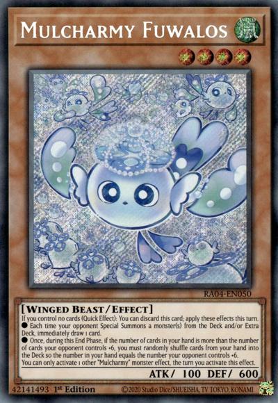 If you control no cards (Quick Effect): You can discard this card; apply these effects this turn.● Each time your opponent Special Summons a monster(s) from the Deck and/or Extra Deck, immediately draw 1 card.● Once, during this End Phase, if the number of cards in your hand is more than the number of cards your opponent controls +6, you must randomly shuffle cards from your hand into the Deck so the number in your hand equals the number your opponent controls +6.You can only activate 1 other ‘Mulcharmy’ monster effect, the turn you activate this effect.