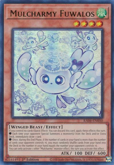 If you control no cards (Quick Effect): You can discard this card; apply these effects this turn.● Each time your opponent Special Summons a monster(s) from the Deck and/or Extra Deck, immediately draw 1 card.● Once, during this End Phase, if the number of cards in your hand is more than the number of cards your opponent controls +6, you must randomly shuffle cards from your hand into the Deck so the number in your hand equals the number your opponent controls +6.You can only activate 1 other ‘Mulcharmy’ monster effect, the turn you activate this effect.