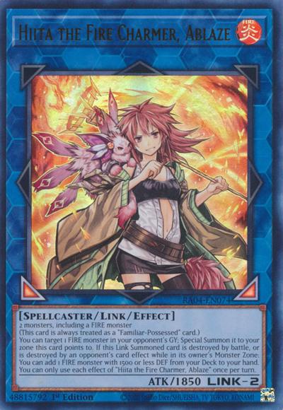 2 monsters, including a FIRE monster(This card is always treated as a ‘Familiar-Possessed’ card.)You can target 1 FIRE monster in your opponent’s GY; Special Summon it to your zone this card points to. If this Link Summoned card is destroyed by battle, or is destroyed by an opponent’s card effect while in its owner’s Monster Zone: You can add 1 FIRE monster with 1500 or less DEF from your Deck to your hand. You can only use each effect of ‘Hiita the Fire Charmer, Ablaze’ once per turn.