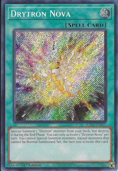 Special Summon 1 ‘Drytron’ monster from your Deck, but destroy it during the End Phase. You can only activate 1 ‘Drytron Nova’ per turn. You cannot Special Summon monsters, except monsters that cannot be Normal Summoned/Set, the turn you activate this card.